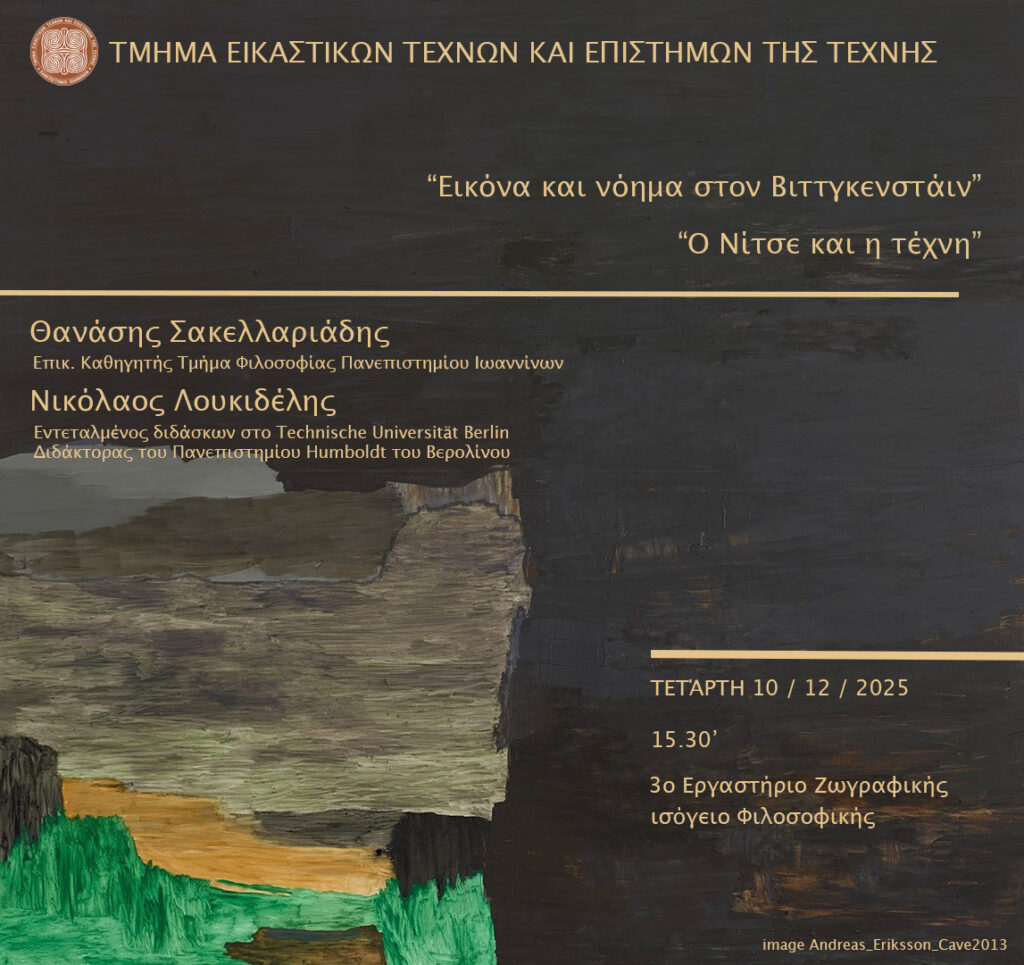 Την Τετάρτη 15.30 στο εργαστήριο ζωγραφικής (ισόγειο της Φιλοσοφικής) θα υπάρξει διάλεξη Φιλοσοφίας των Θανάση Σακελλαριάδη και Νικόλαου Λουκιδέλη με εισαγωγική προσέγγιση στους Βιττγκενστάιν και Νίτσε.
